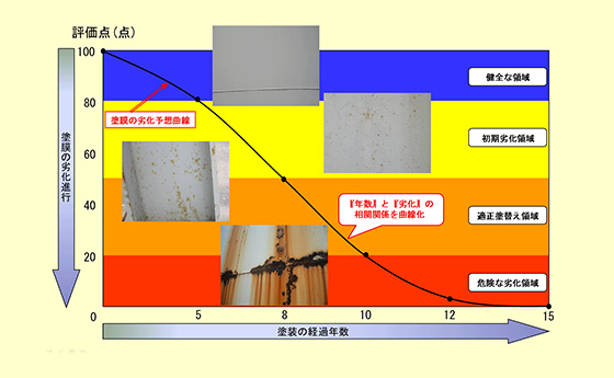 KASHIWABARA-CMS調査診断シートにより劣化状態と分布をビジュアル化するとともに塗膜寿命を算出し、劣化進行を予測することで腐食・孔食による設備損傷を未然に防ぎ、安定操業に寄与します。